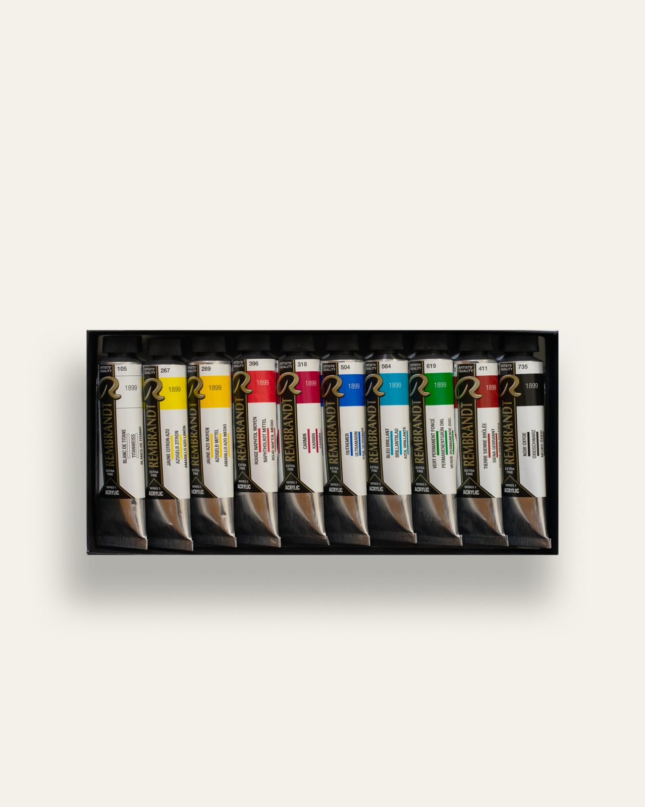 Widely recognised for their superior and unparalleled quality paints, Rembrandt consistently meets the strict requirement of today's artists. This set of ten acrylic colours delivers against expectations with brilliant colour quality and a heavy-body to ensure clear brush strokes. It also features the highest degree of lightfastness.
