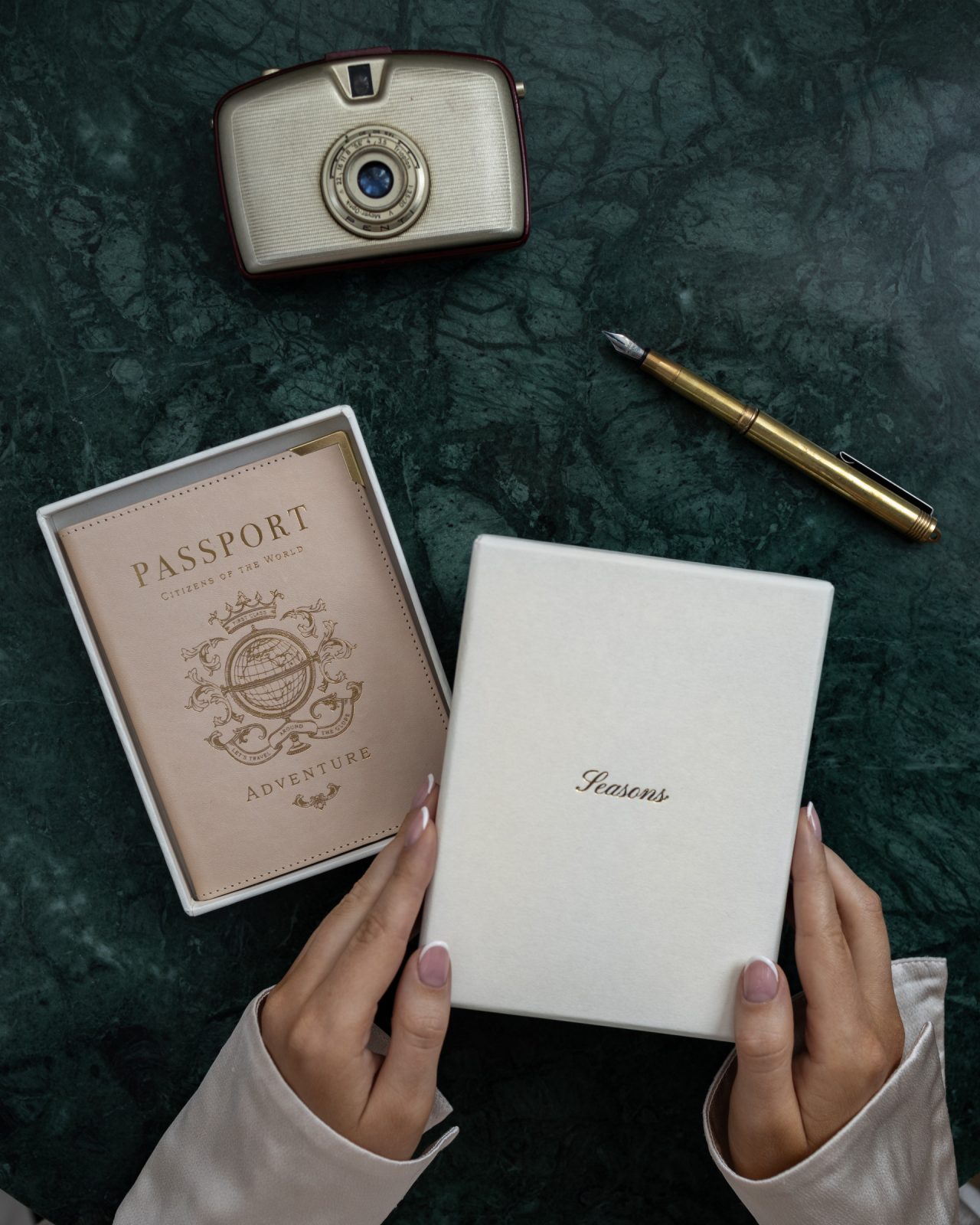 Calling citizens of the world! Travel in style with our iconic leather passport holder featuring a bespoke illustrated emblem on the front cover and blind embossed Seasons logo on the rear. Designed to protect your passport and provide an aesthetic flourish, this cover is made from real leather with a smooth firm outer and complete with golden metal corners for a luxurious experience. Each passport cover is supplied in a custom Seasons branded presentation box.