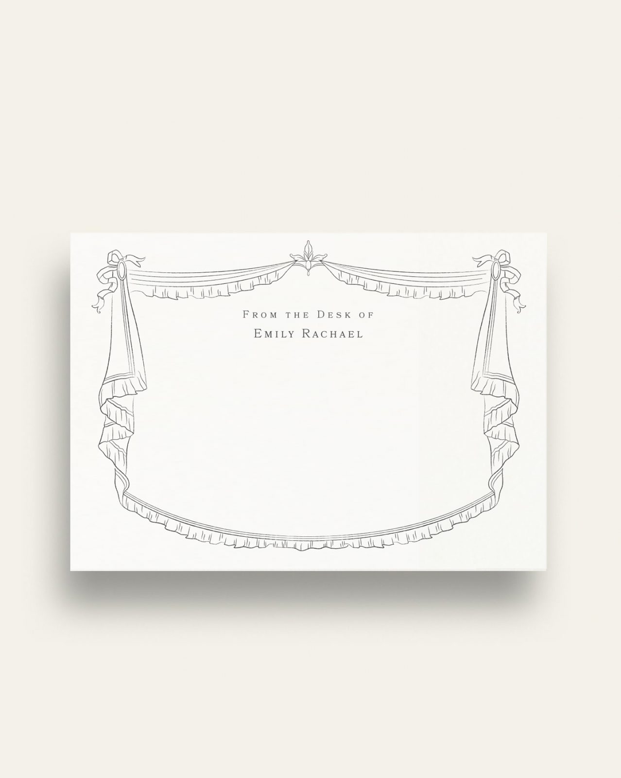 Our beautifully crafted correspondence cards feature playful motifs inspired by eighteenth century trade-cards; when illustration was used playfully to convey the nature of the bearer’s trade. This particular design lends credence to the expression that there’s no business like show business, with dramatic swooping curtains for a theatrical flourish.