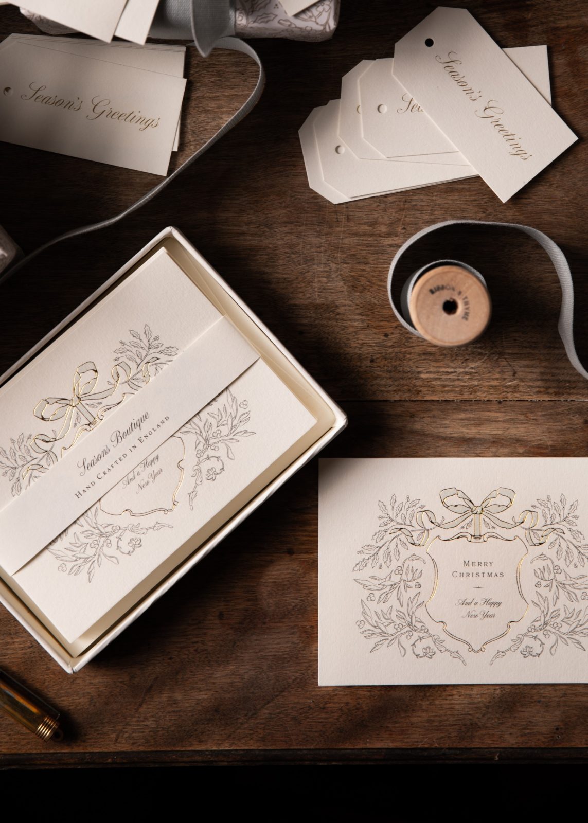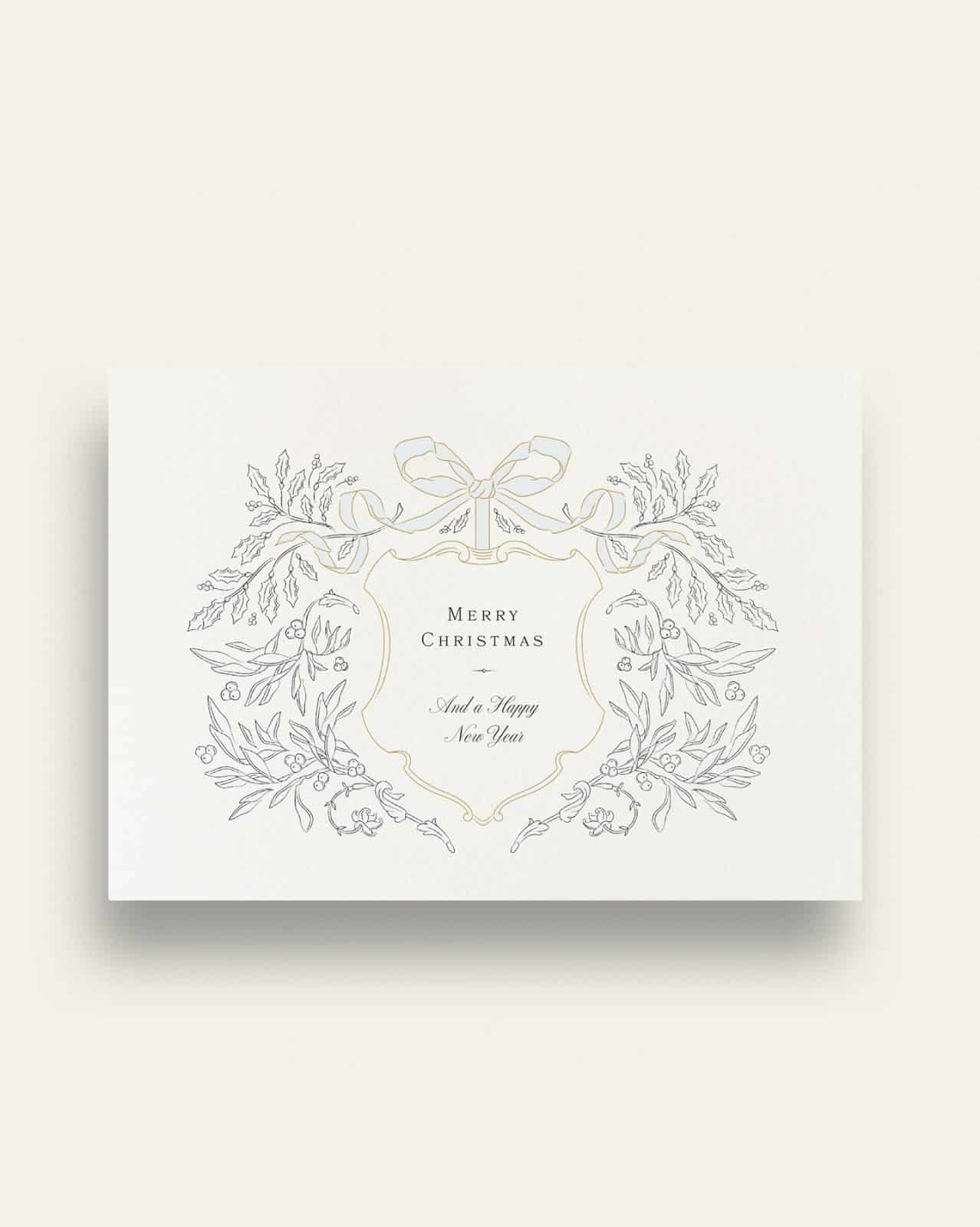 Decked with boughs of holly and mistletoe branches, wish your friends and family a Merry Christmas and a Happy New Year with this charming card. Embrace the seasons tidings with this boxed set of ten greetings cards. Featuring a whimsical illustration and gold embossed detailing on natural white wove folded A6 card, each card has been crafted in England using the finest GF smith paper. The inside has, of course, been left blank for you to express your own festive message. Each set comes complete with ten elegant natural envelopes and supplied in a sleek presentation box.