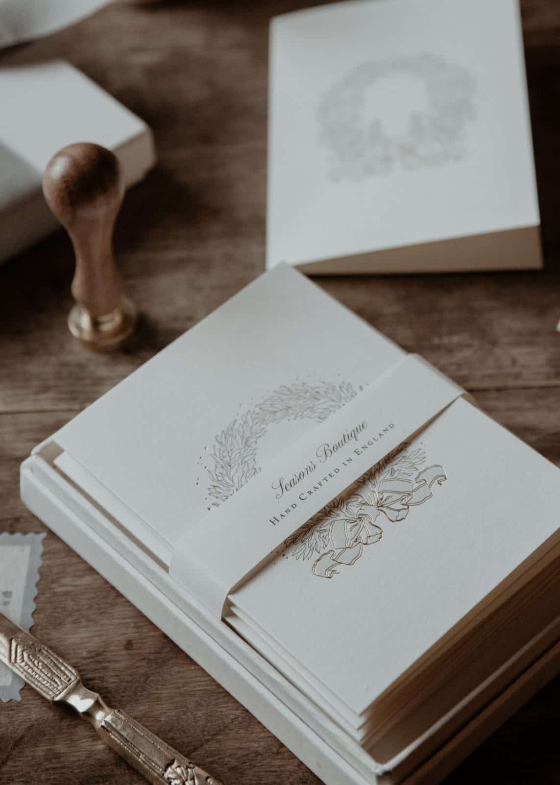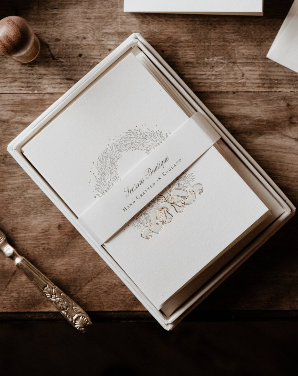 What heralds the festive season more than a jubilant wreath hung on the front door or over a fireplace? Embrace the seasons tidings with this boxed set of ten greetings cards. Featuring a whimsical illustration and gold embossed detailing on natural white wove folded A6 card, each card has been crafted in England using the finest GF smith paper. The inside has, of course, been left blank for you to express your own festive message. Each set comes complete with ten elegant natural envelopes and supplied in a sleek presentation box.