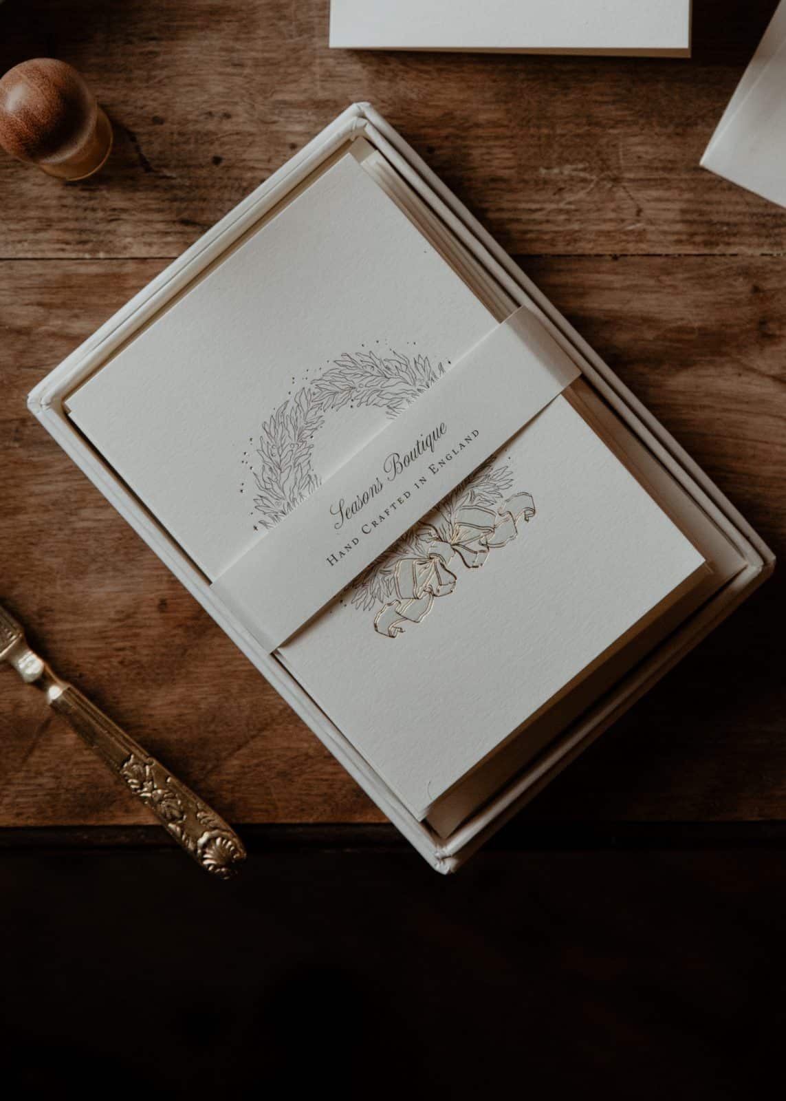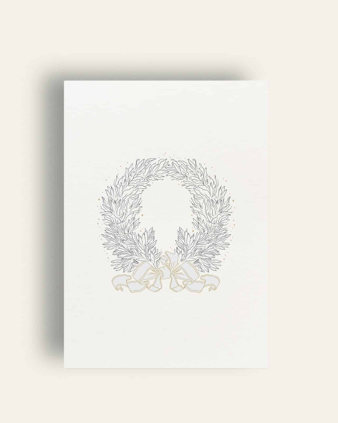 What heralds the festive season more than a jubilant wreath hung on the front door or over a fireplace? Featuring a whimsical illustration and gold embossed detailing on natural white wove folded A6 card, each card has been crafted in England using the finest GF smith paper and comes complete with an elegant natural envelope. The inside has, of course, been left blank for you to express your own festive message.