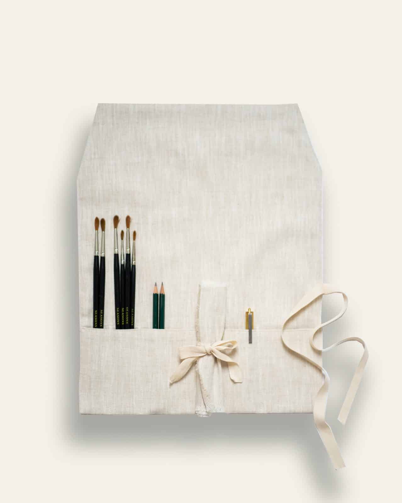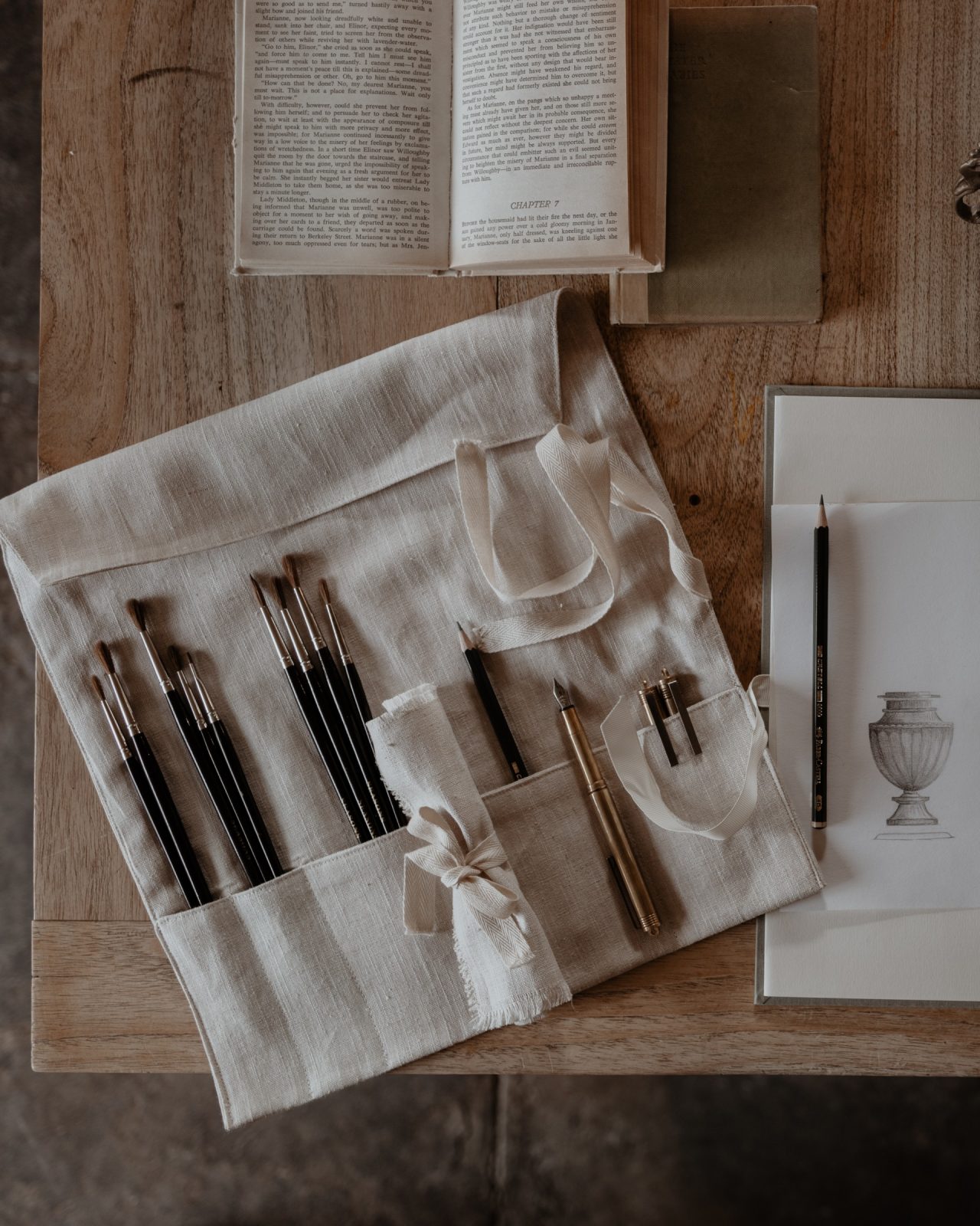 This beautiful bespoke linen wrap is a stylish way to store all of your essential creative tools–keep your pens, pencils, and brushes in one place.