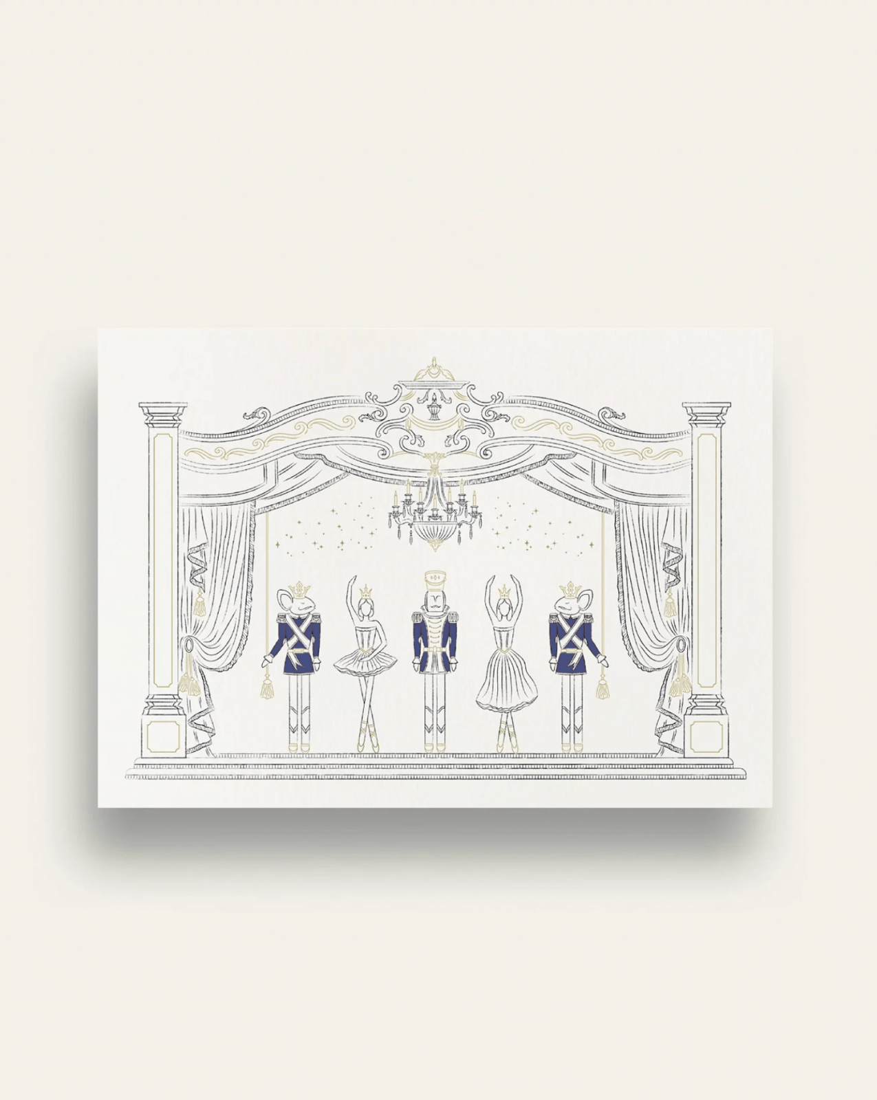 Behold, the enchanting spectacle of the Seasons’ Nutcracker ballet. Whisk family and friends away with delightful details that are bound to stir the festive spirit. Featuring a whimsical illustration and gold embossed detailing on natural white wove folded A6 card, each card has been crafted in England using the finest GF smith paper and comes complete with an elegant navy envelope. The inside has, of course, been left blank for you to express your own festive message.