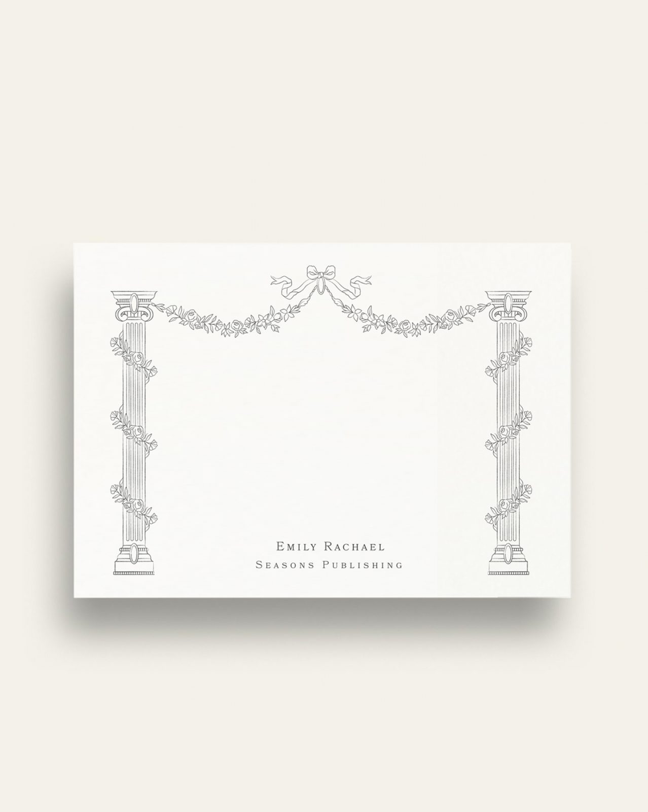 Our beautifully crafted correspondence cards feature playful motifs inspired by eighteenth century trade-cards; when illustration was used playfully to convey the nature of the bearer’s trade. Embellished with Ancient Greek ionic columns wrapped in climbing roses and united ceremoniously by a ribboned garland, this classically inspired design speaks of a poetic nature.