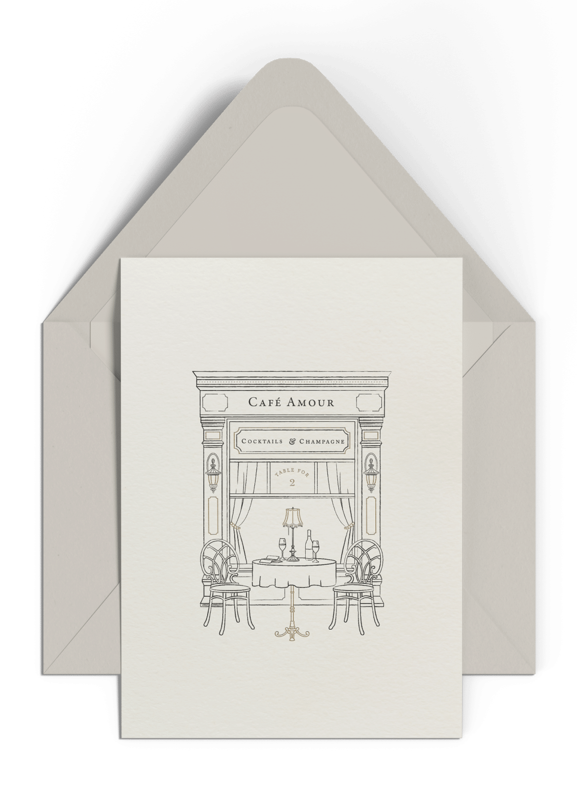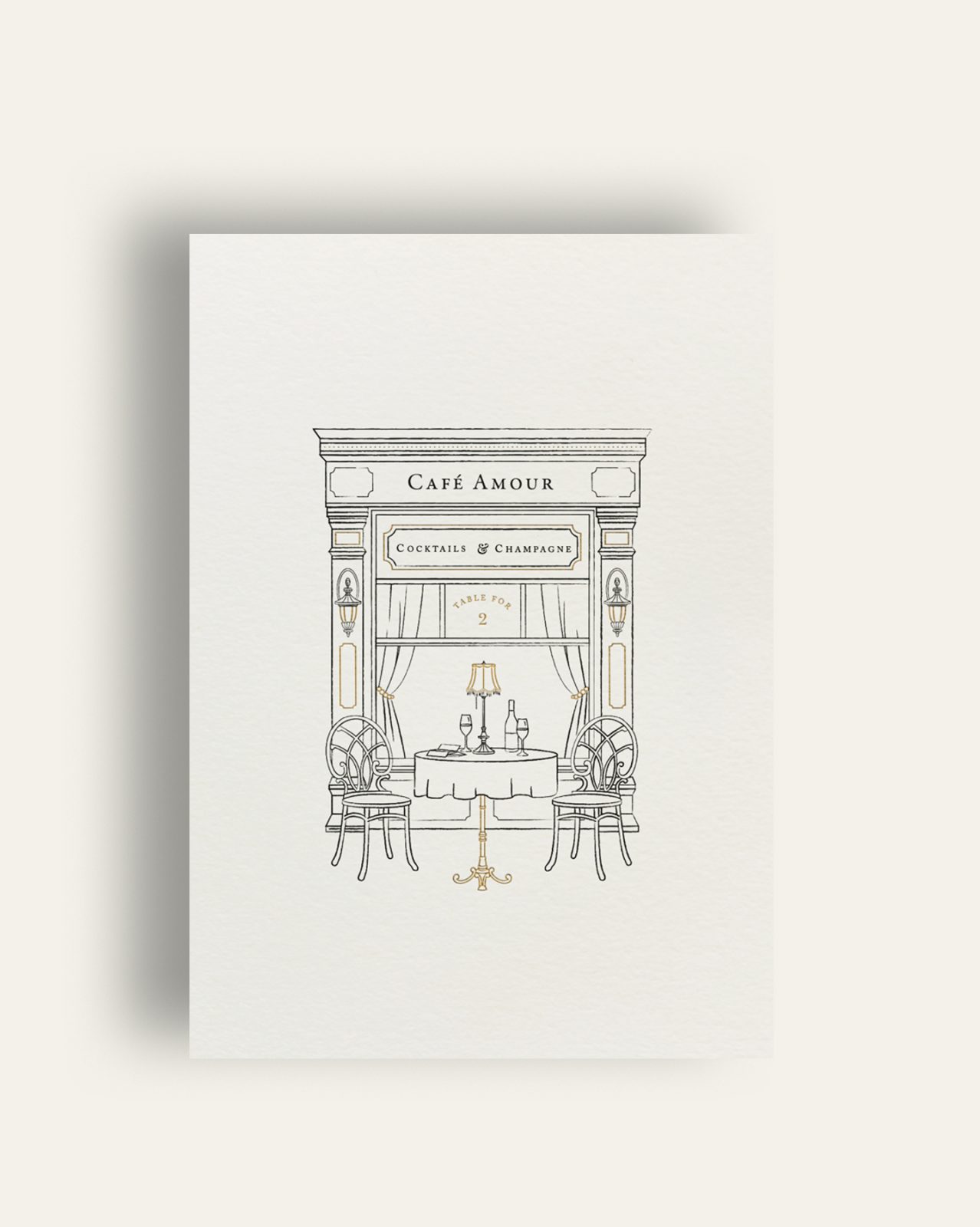 A reservation at the Café Amour is not one you will regret, nor forget. Alive with enchanting detail, our beautiful hand-drawn illustration is a playful imagination of the perfect night spent sharing a romantic meal, and perhaps a bottle of wine, with the one you love most in the world.