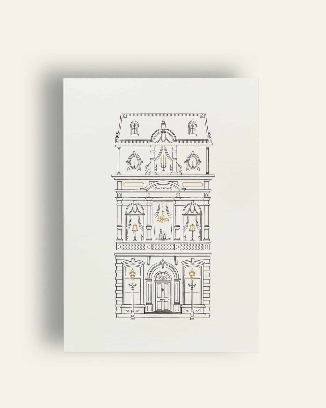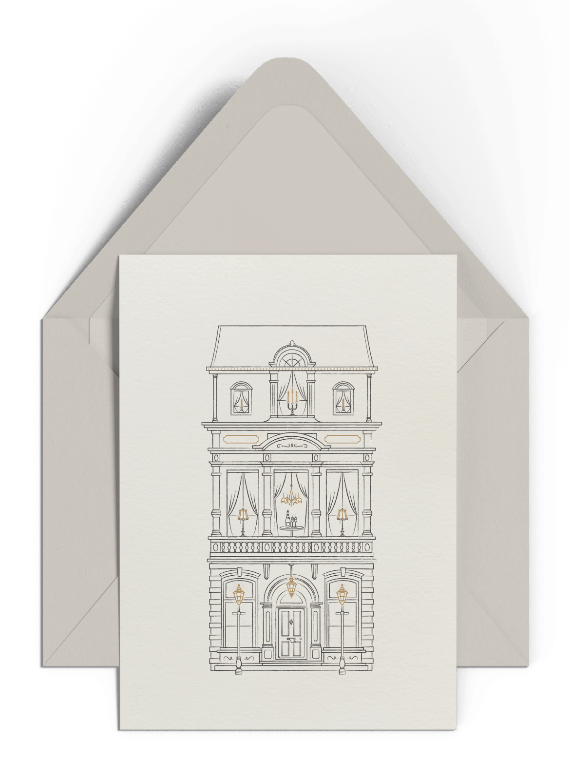 Behold the Seasons Townhouse in all of its finely detailed splendour. Note the delicate light fixtures and studied masonry with both engraved and gold embossed detailing. A perfect sentiment to wish a friend congratulations on a new house or to extend an invitation to a housewarming.